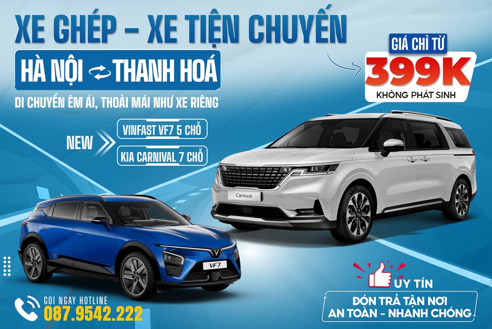 Hiện nay, chúng tôi chuyên chạy xe ghép, xe tiện chuyến tuyến Hà Nội ↔ Thanh Hóa với 2 dòng xe đời mới và hiện đại gồm: Vinfast VF7 5 chỗ và KIA Carnival 7 chỗ. Xe được kiểm tra, bảo dưỡng định kỳ thường xuyên. Đảm bảo chạy êm ái và ổn định trong suốt chuyến đi.